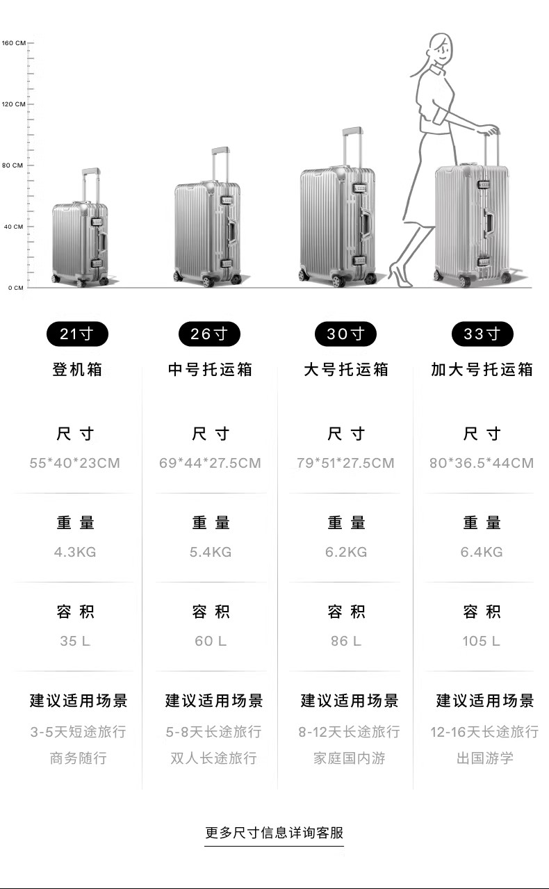 21寸(经典款登机箱) ,26寸(经典款托运箱) ,30寸(经典款托运箱) ,33寸TRUNK(运动版托运箱) |